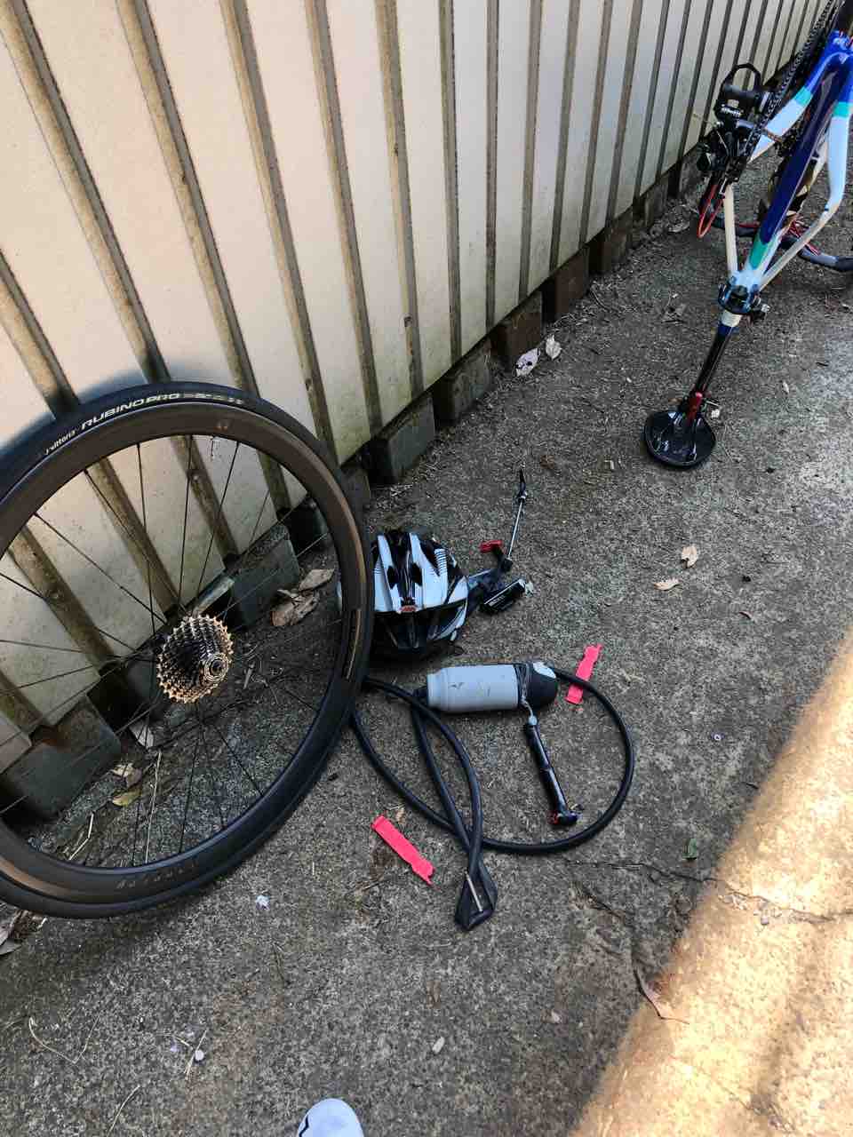 100mほど走ったところで、リアのホイールに違和感。振れちゃった?いや、これは…パンクだ!