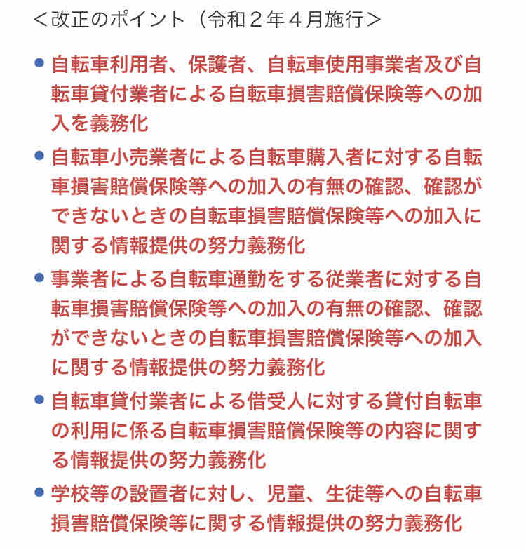 改正のポイントを見る限り、自転車利用者の保険加入は単なる努力義務ではなく義務化のようです。