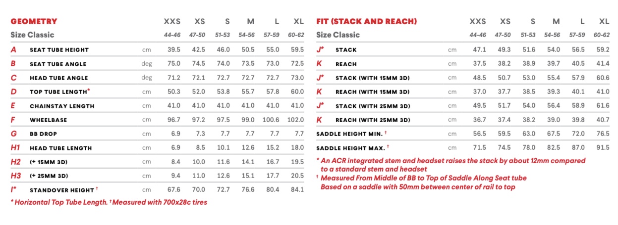 ヘッドチューブのベアリングの位置を変えることで、剛性を損なわずにスタック/リーチを調整できるという機能的な3Dシステムをそれぞれ使った場合の値を書いてくれているのは昔から親切丁寧だなぁと思う。